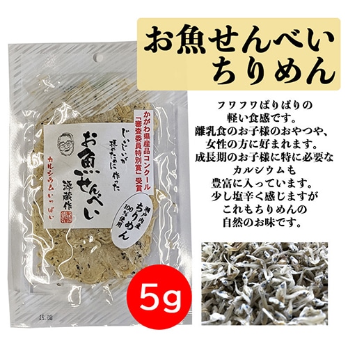 フワフワばりばりの軽い食感。離乳食のお子様のお菓子や女性の方に好まれます。成長期のお子様に特に必要なカルシウムも豊富に入っています。少し塩辛く感じますが、これもちりめん本来のお味です。