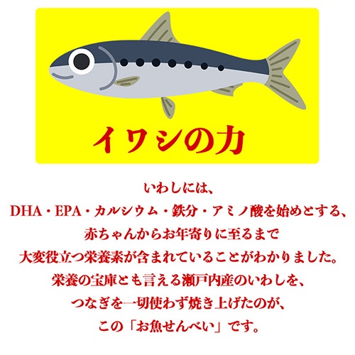 お魚せんべいの代表格!一枚のせんべいも頭から尻尾まで、いりこが使われています。3種類の中でもカルシウムが最も多く含まれています。