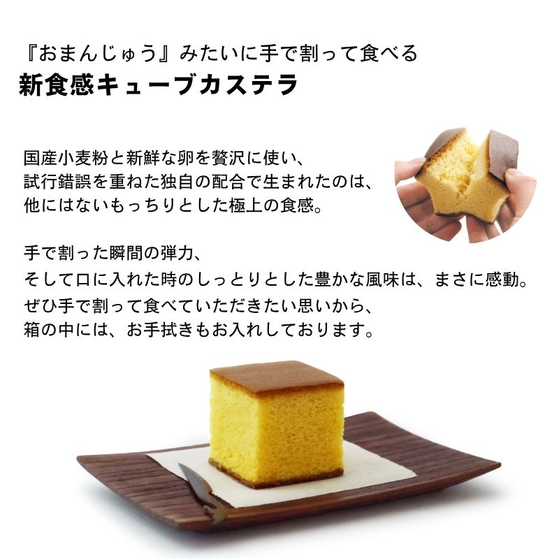 | 内容量 | 1箱(1個入り)約55g/お手拭入り (箱のサイズ約6.5cm角、カステラ約5.5cm角) |