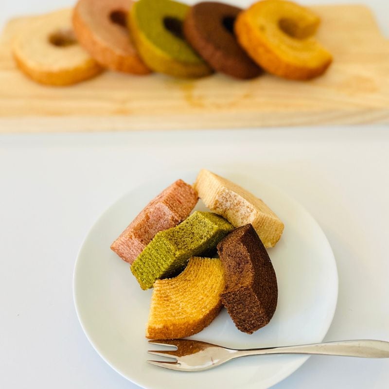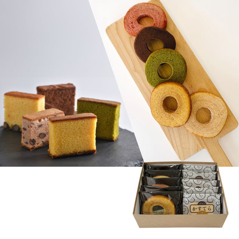 | 内容量 | 合計10袋入り 【カステラ 5袋】 ・和三盆プレーン×1袋 ・ショコラ×1袋 ・抹茶×1袋 ・大納言×1袋 ・黒豆×1袋 【バームクーヘン 5袋】 ・プレーン×1袋 ・ショコラ×1袋 ・抹茶×1袋 ・イチゴ×1袋 ・クリームチーズ×1袋 |