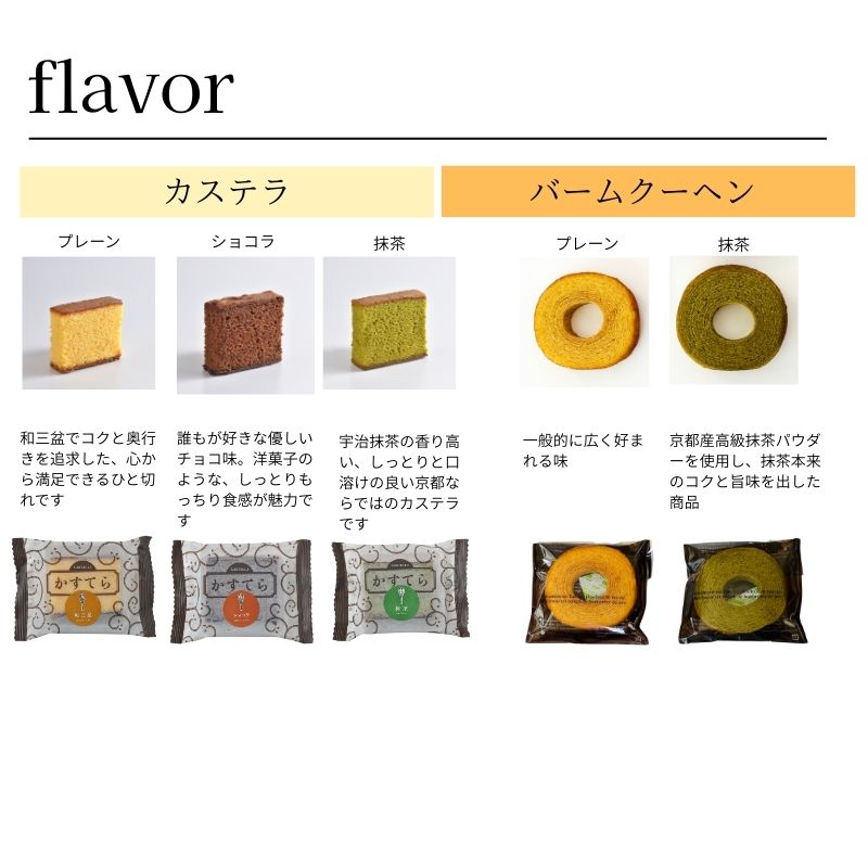 | 内容量 | 合計5袋入り 【カステラ 3袋】 ・和三盆プレーン×1袋 ・ショコラ×1袋 ・抹茶×1袋 【バームクーヘン 2袋】 ・プレーン×1袋 ・抹茶×1袋 |