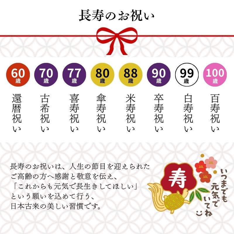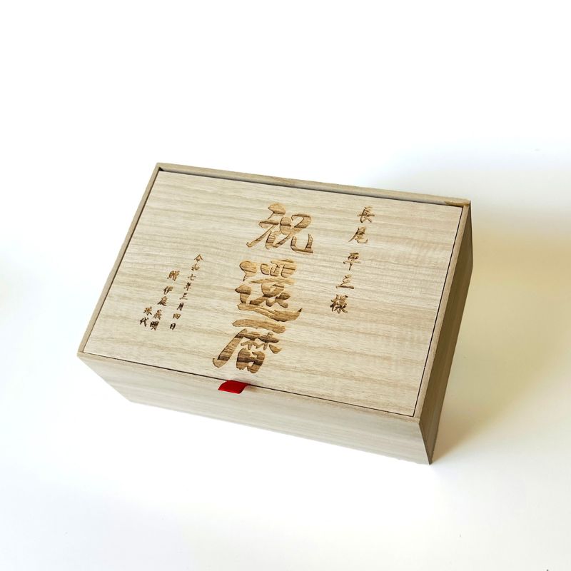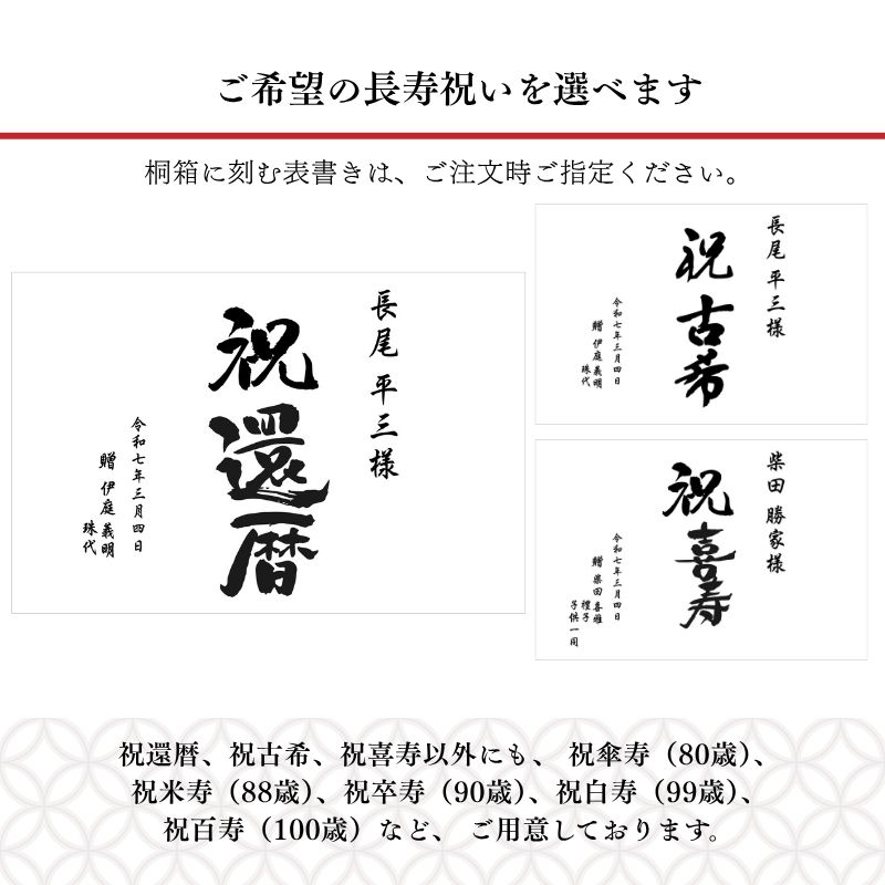 還暦祝い(60歳)をはじめ、古希(70歳)、喜寿(77歳)、傘寿(80歳)、米寿(88歳)、卒寿(90歳)、白寿(99歳)、**百寿(100歳)など、ご希望の長寿御祝いに対応し、大きく「祝〇〇」と焼印いたします。