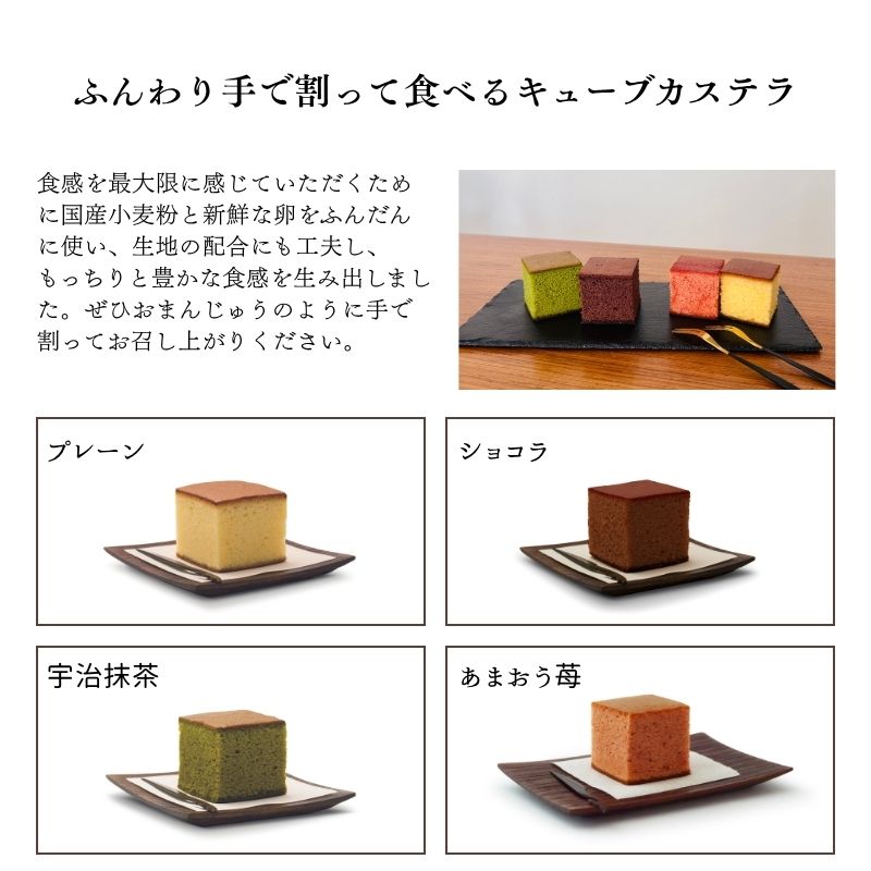 | 内容量 | キューブカステラ 1個入り×6(プレーン2、抹茶2、いちご、ショコラ各1) (箱のサイズ約6.5cm角、カステラ約5.5cm角) |