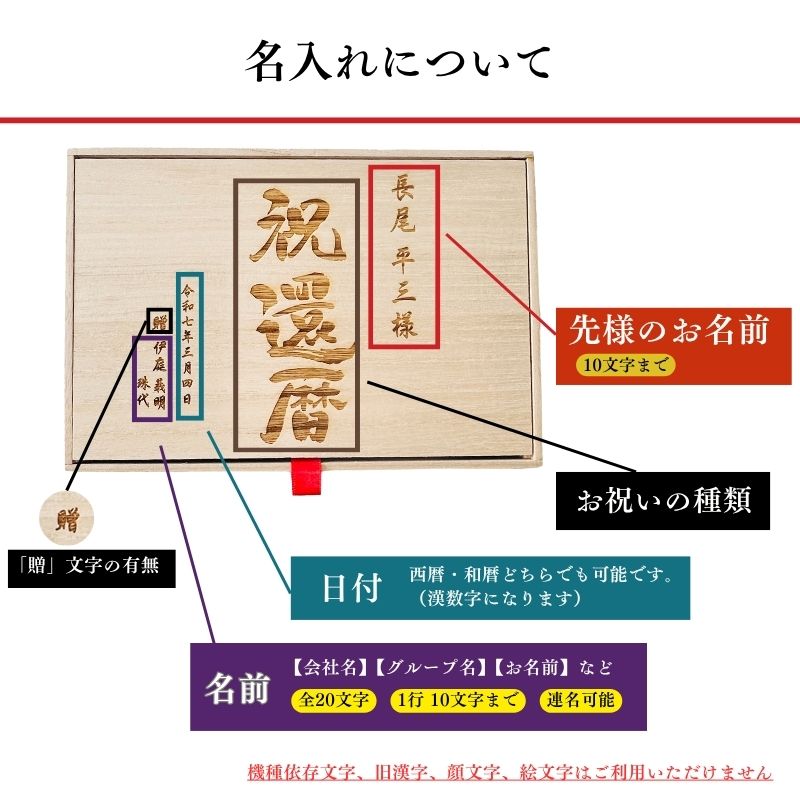 お相手(先様)のお名前、贈る日付、そして贈り主(会社名、グループ名、または個人名)を焼印し、世界に一つだけの特別な贈り物をお作りします。
